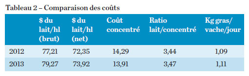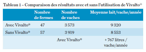Les résultats obtenus, tels que démontrés au tableau 1, sont éloquents! Les vaches bénéficiant de Vivalto® ont produit 767 litres de lait de plus que les vaches sans Vivalto®. Ce résultat représente 2,42 litres/vache/jour de plus. Nous sommes donc très près du résultat de 2,7 kg obtenu à la ferme de recherche.